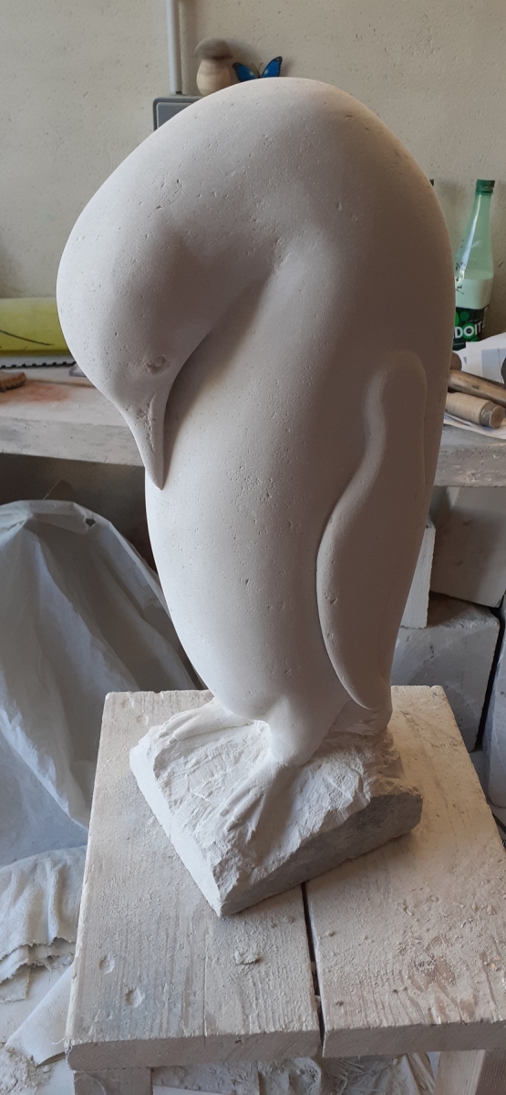 J’ai adoré l’esthétique de cet animal, si massif, et pourtant gracieux, sur sa glace, malgré sa démarche gauche, qui le rend très attachant. Le profil était superbe, avec ce simple noir-blanc, réhaussé d’orangé sur la tête. Ce qui a été compliqué, c’est le rendu du blanc immaculé. Ca ne rend rien, il faut du sombre, sinon, pas de pelage blanc. C’est comme le noir, il faut du blanc.