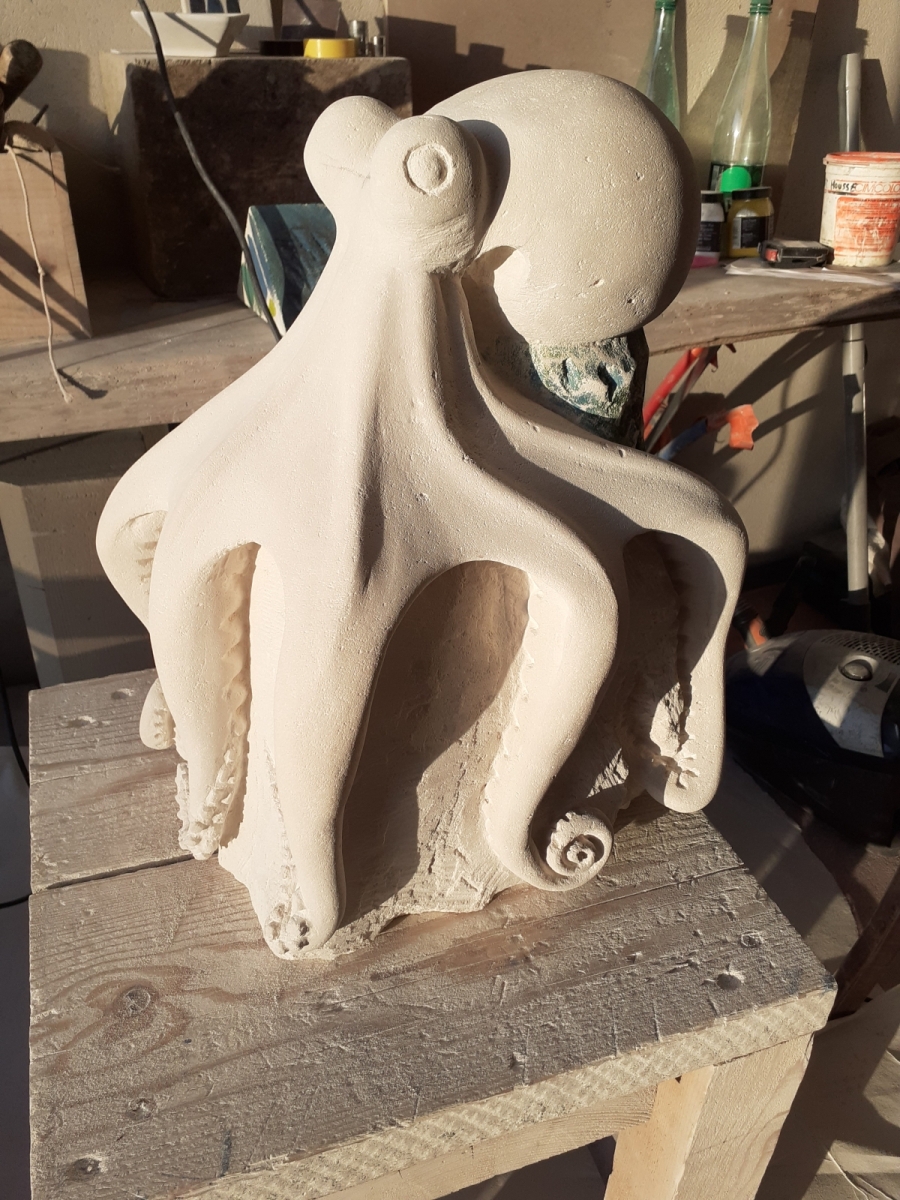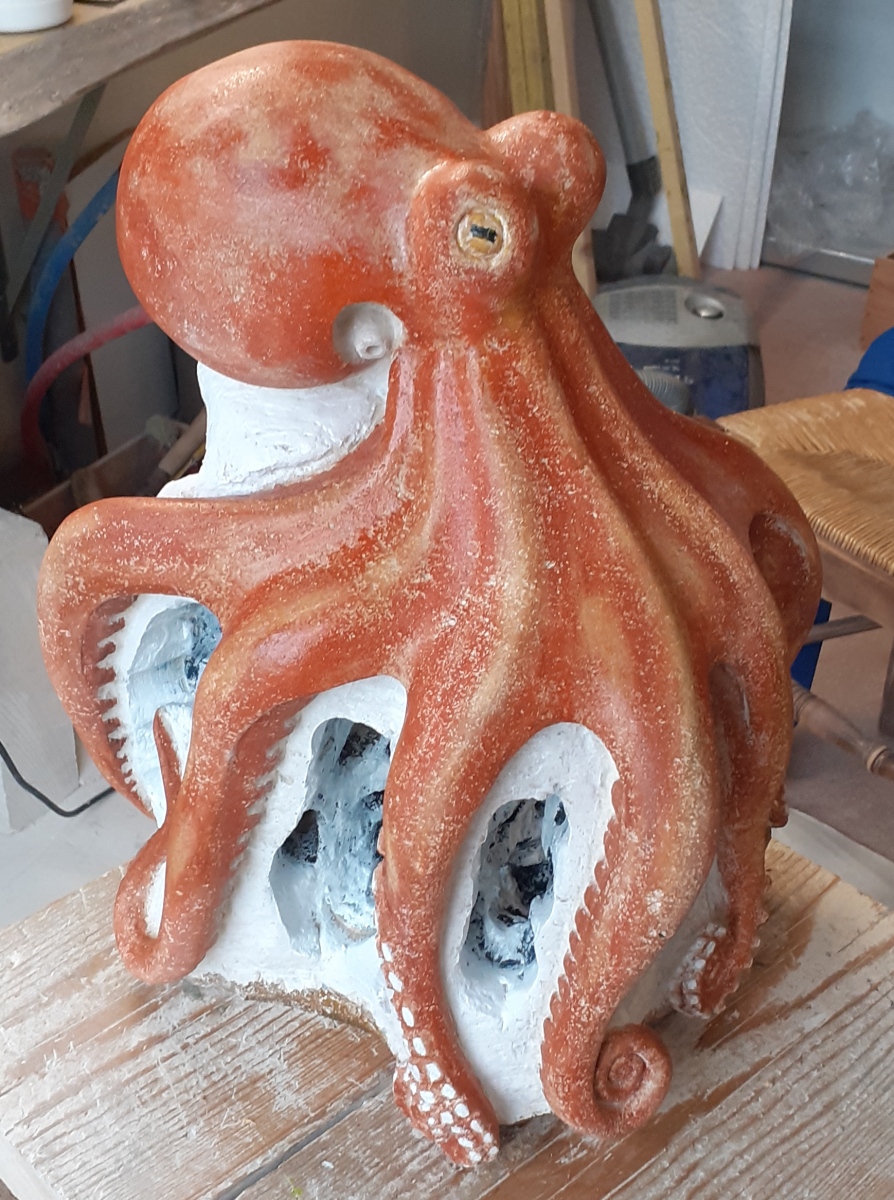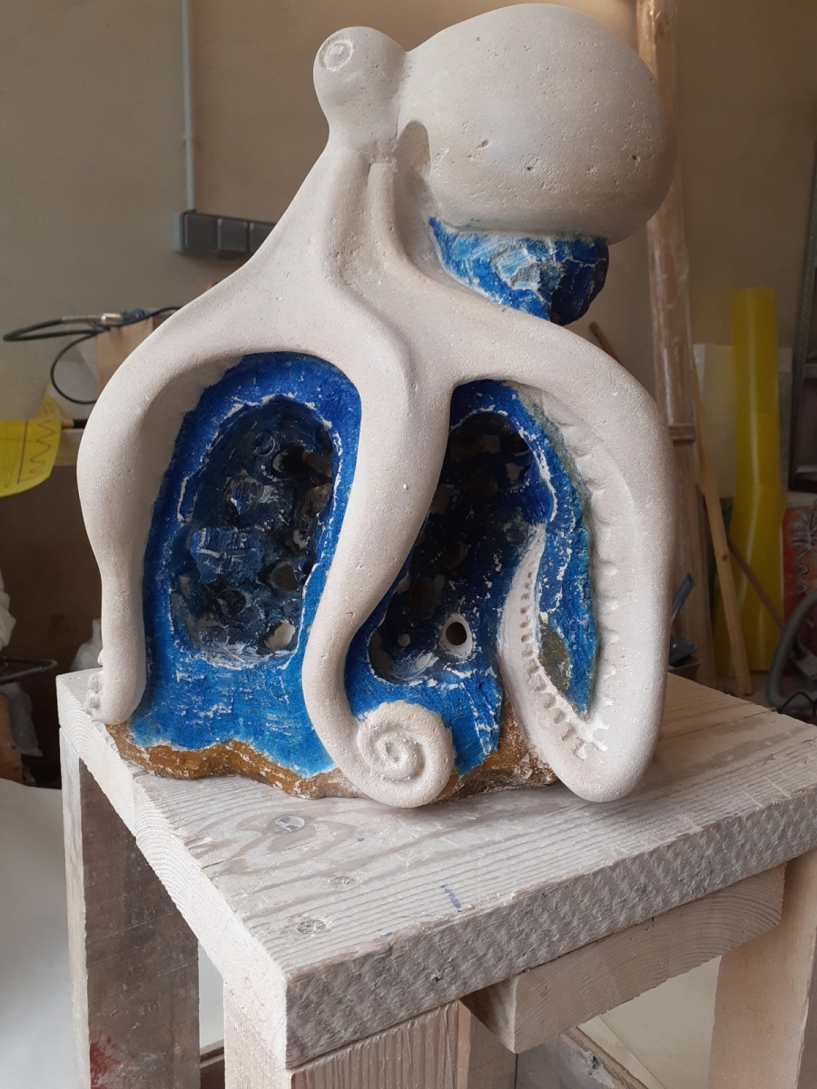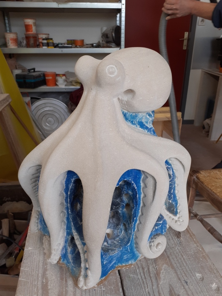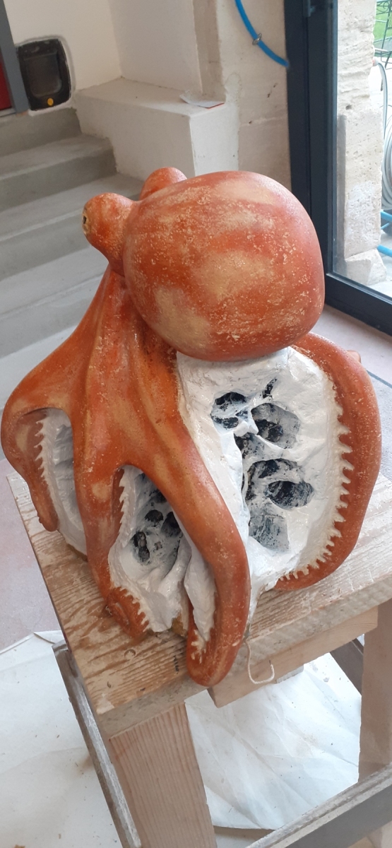 C’est l’animal qui m’a demandé le plus d’heures de travail(entre 100 et 150). A partir d’un bloc de 50 x 30 x 30, j’ai commencé par dégager la tête, puis les tentacules, grossièrement. Une fois la forme générale obtenue, j’ai fignolé les tentacules. La première version était pierre nature sur fond bleu, et pesait 3 tonnes. Mais le résultat ne me plaisait pas, et je suis tombé sur une pieuvre rouge brique, qui tout de suite m’a emballée. J’ai donc peint l’ensemble, et j’ai creusé la pierre pour en faire une caverne blanche à fond sombre.