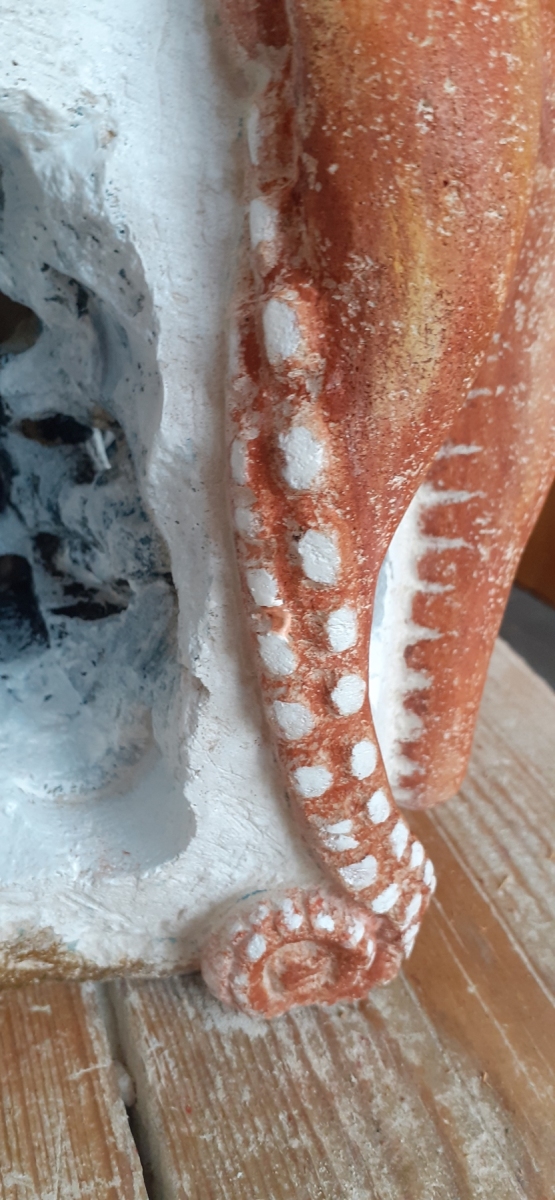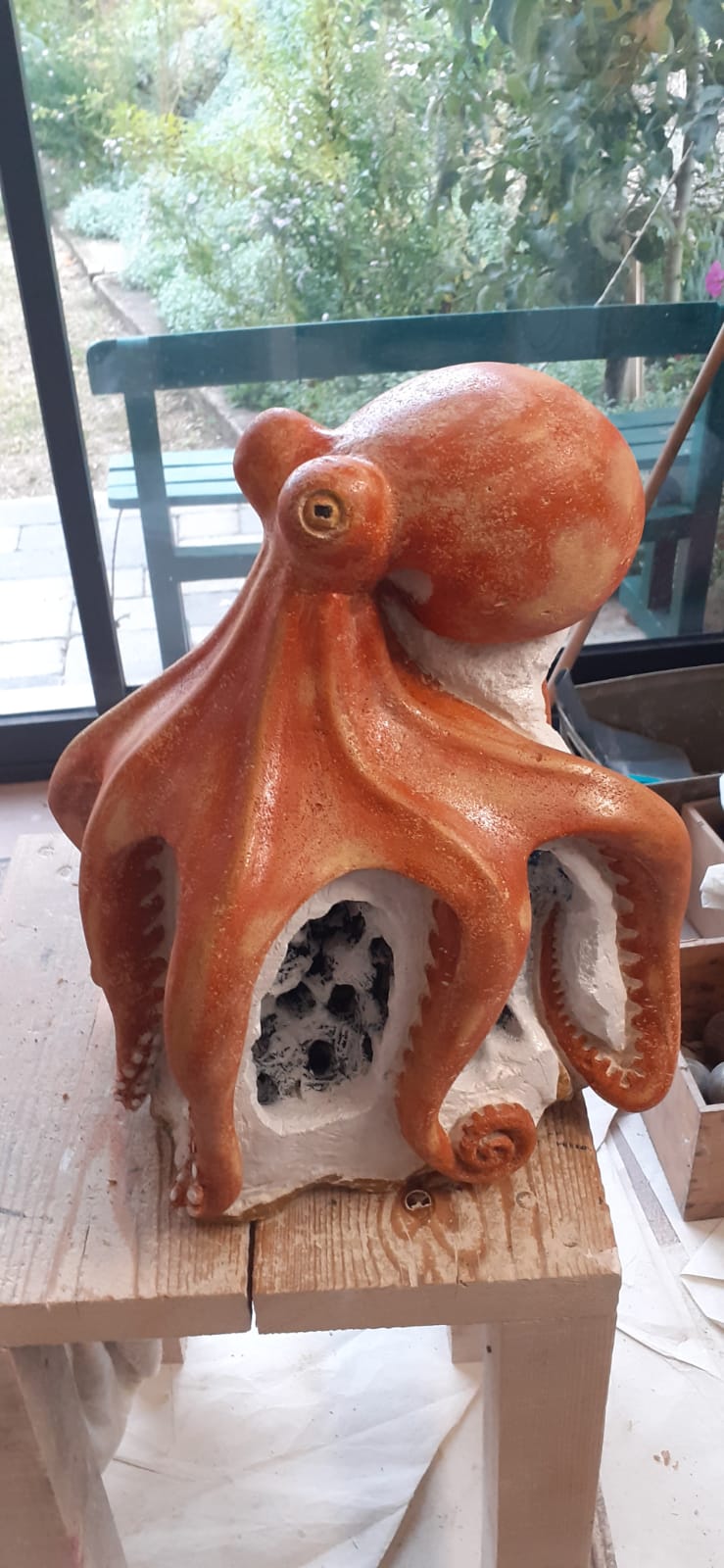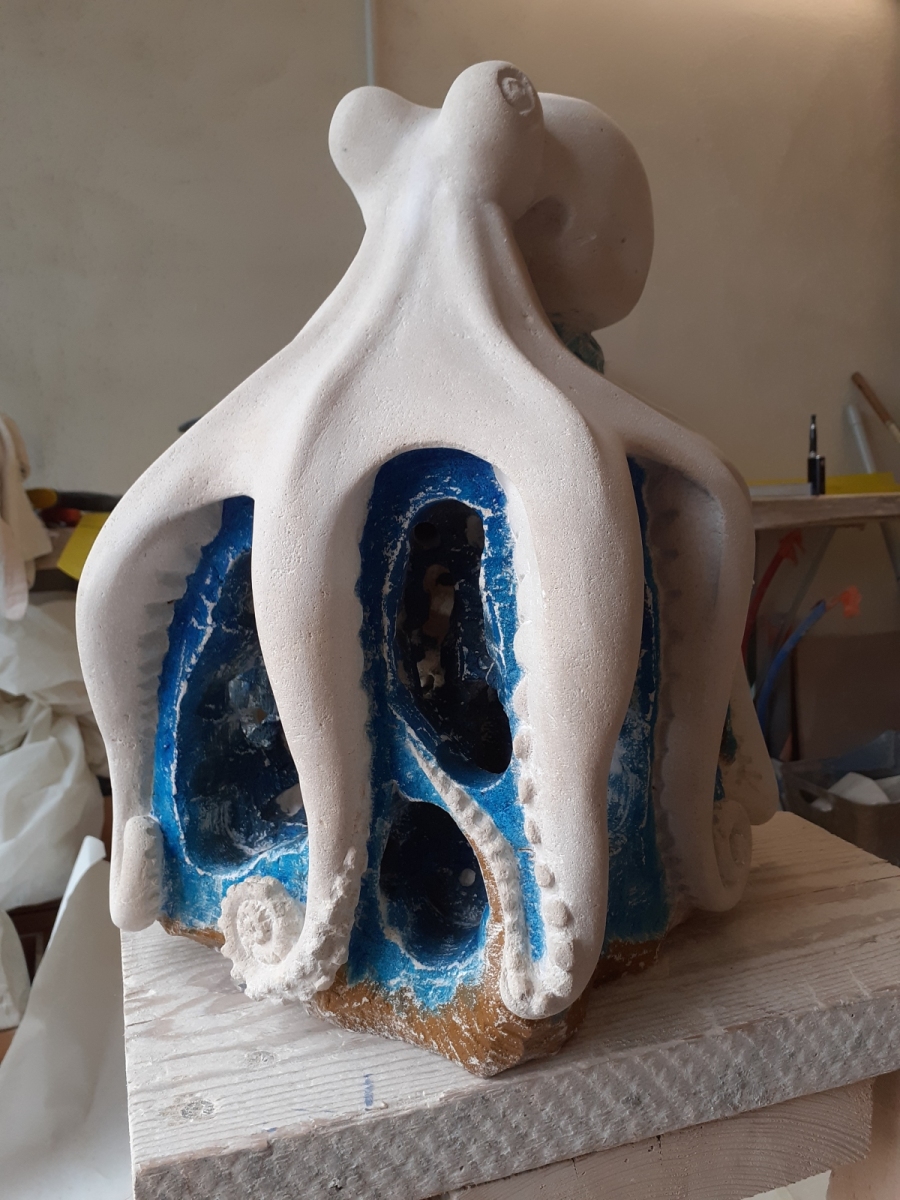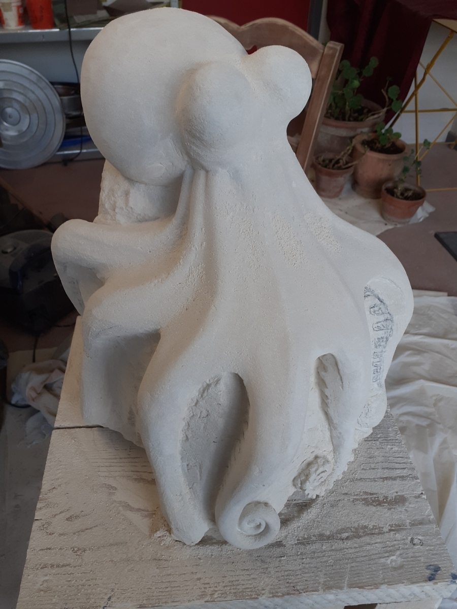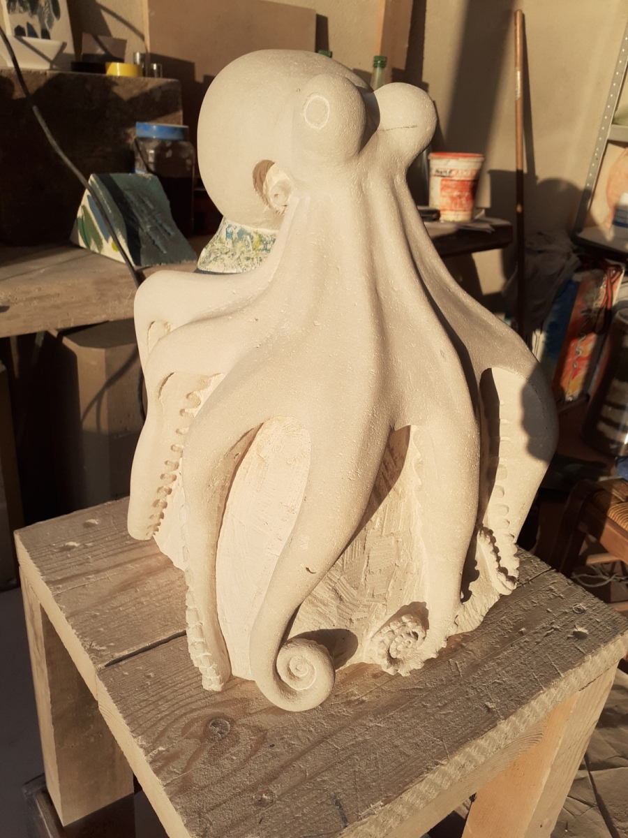 C’est l’animal qui m’a demandé le plus d’heures de travail(entre 100 et 150). A partir d’un bloc de 50 x 30 x 30, j’ai commencé par dégager la tête, puis les tentacules, grossièrement. Une fois la forme générale obtenue, j’ai fignolé les tentacules. La première version était pierre nature sur fond bleu, et pesait 3 tonnes. Mais le résultat ne me plaisait pas, et je suis tombé sur une pieuvre rouge brique, qui tout de suite m’a emballée. J’ai donc peint l’ensemble, et j’ai creusé la pierre pour en faire une caverne blanche à fond sombre.