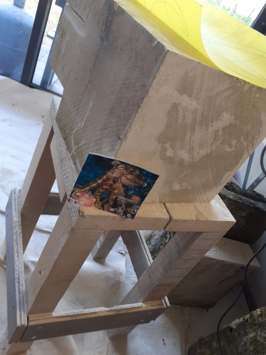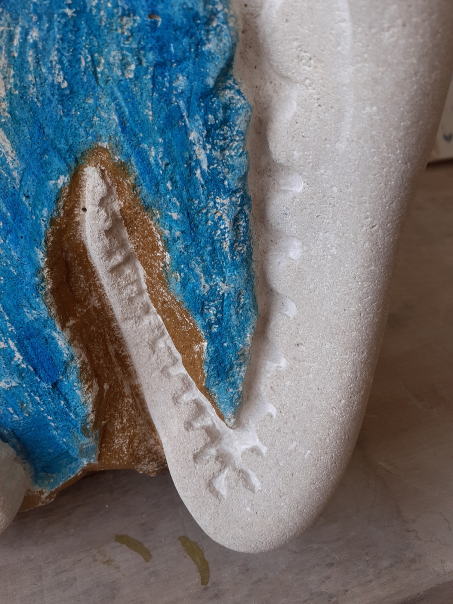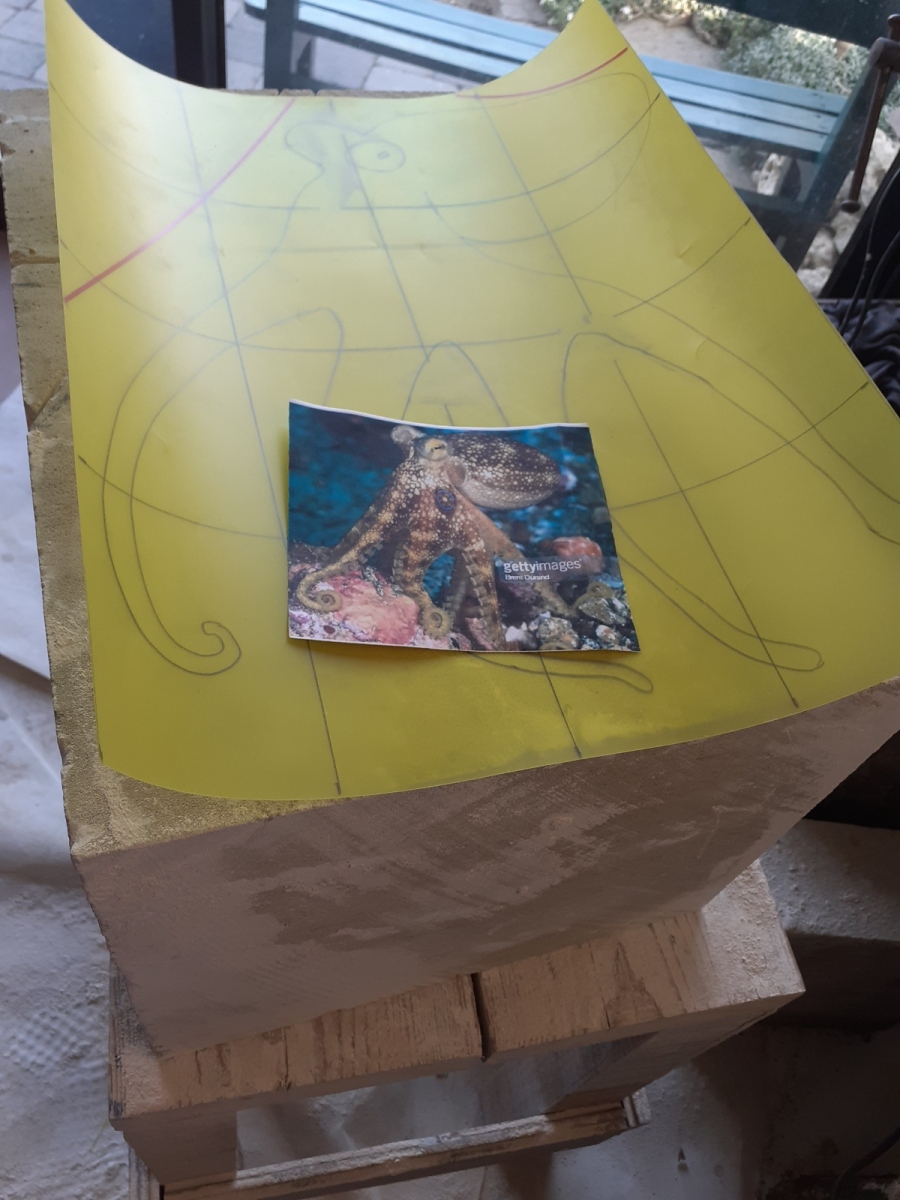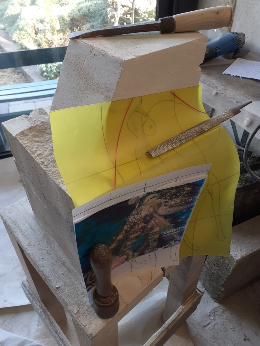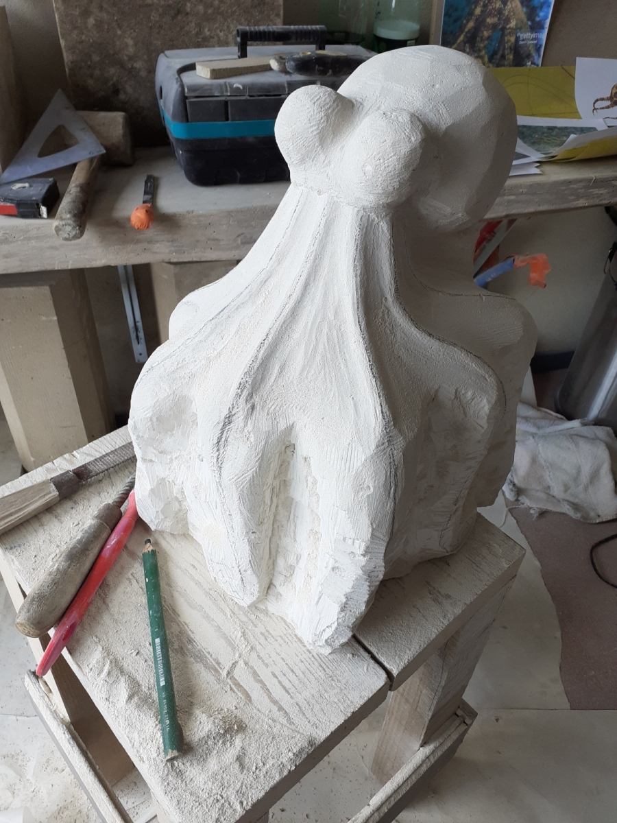 C’est l’animal qui m’a demandé le plus d’heures de travail(entre 100 et 150). A partir d’un bloc de 50 x 30 x 30, j’ai commencé par dégager la tête, puis les tentacules, grossièrement. Une fois la forme générale obtenue, j’ai fignolé les tentacules. La première version était pierre nature sur fond bleu, et pesait 3 tonnes. Mais le résultat ne me plaisait pas, et je suis tombé sur une pieuvre rouge brique, qui tout de suite m’a emballée. J’ai donc peint l’ensemble, et j’ai creusé la pierre pour en faire une caverne blanche à fond sombre.