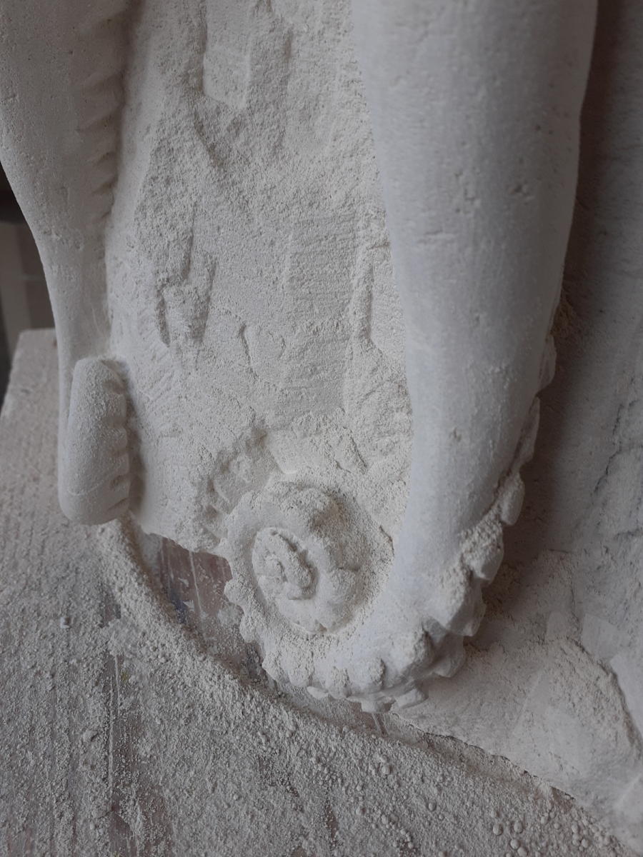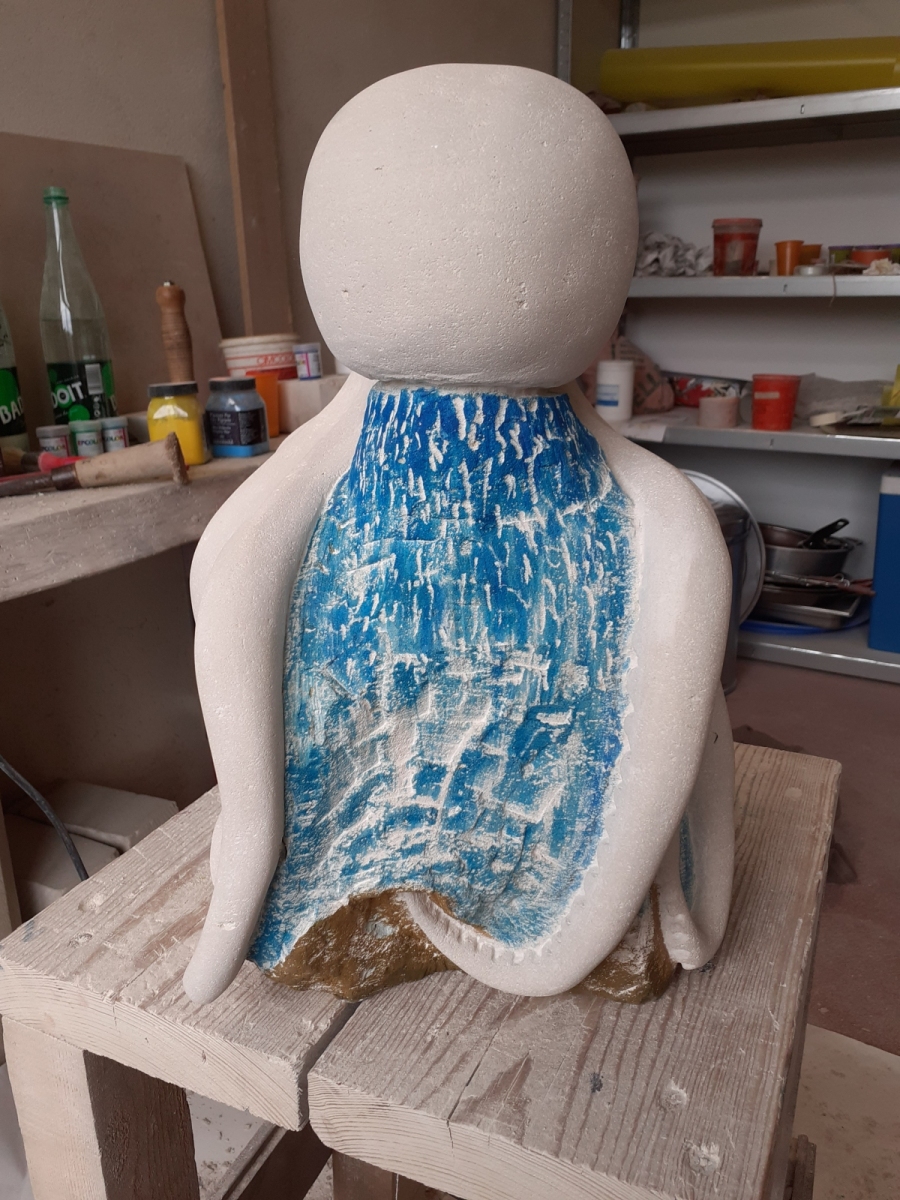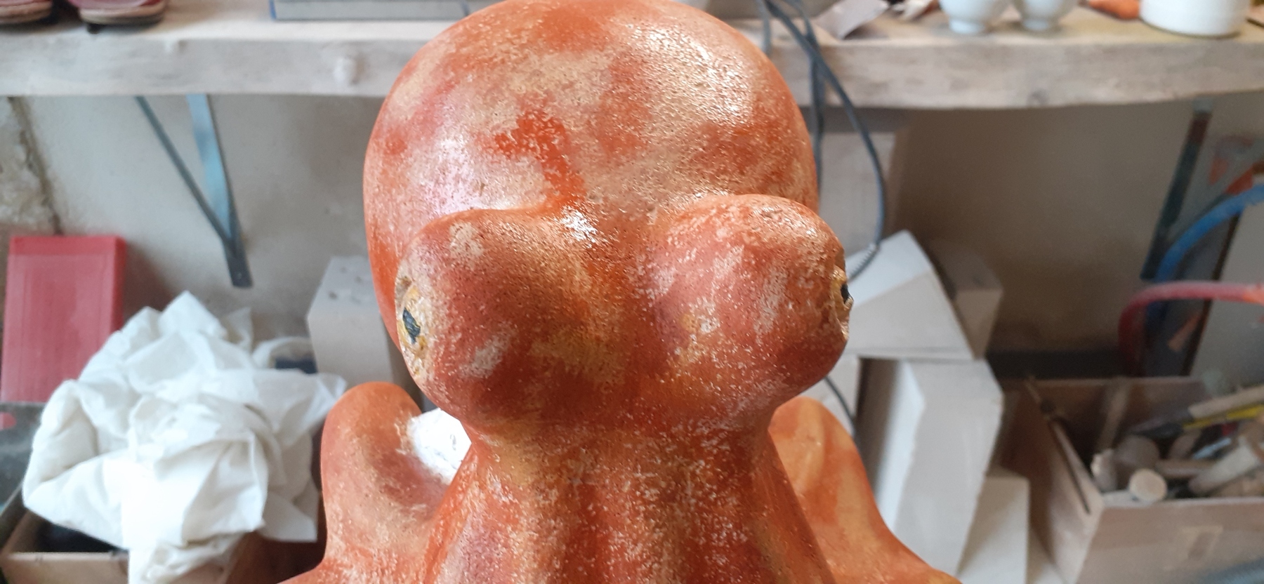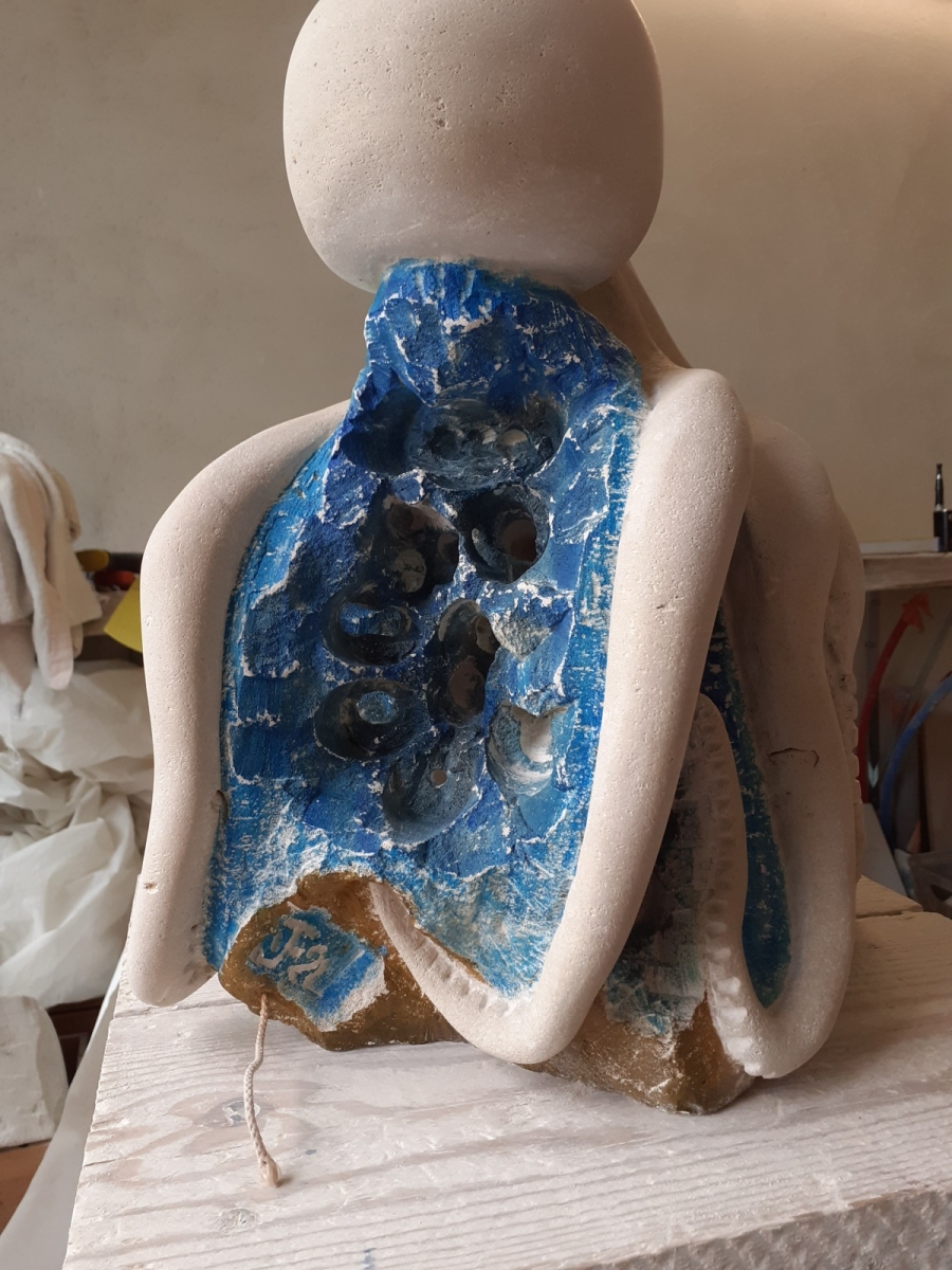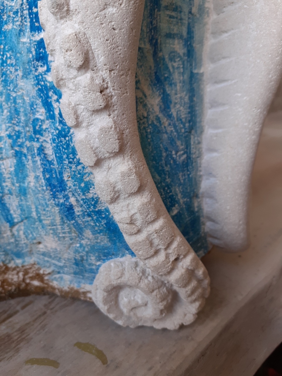 C’est l’animal qui m’a demandé le plus d’heures de travail(entre 100 et 150). A partir d’un bloc de 50 x 30 x 30, j’ai commencé par dégager la tête, puis les tentacules, grossièrement. Une fois la forme générale obtenue, j’ai fignolé les tentacules. La première version était pierre nature sur fond bleu, et pesait 3 tonnes. Mais le résultat ne me plaisait pas, et je suis tombé sur une pieuvre rouge brique, qui tout de suite m’a emballée. J’ai donc peint l’ensemble, et j’ai creusé la pierre pour en faire une caverne blanche à fond sombre.