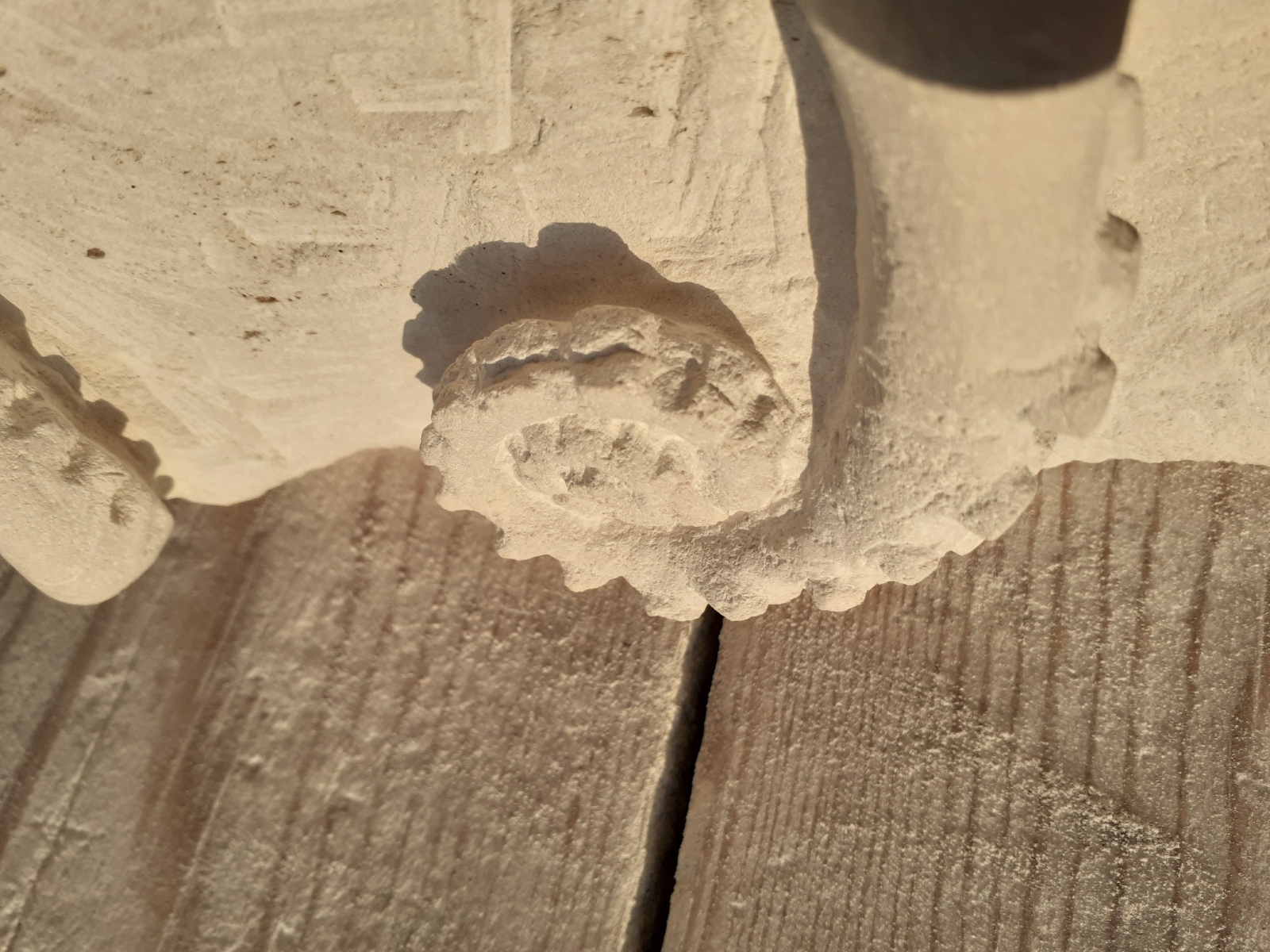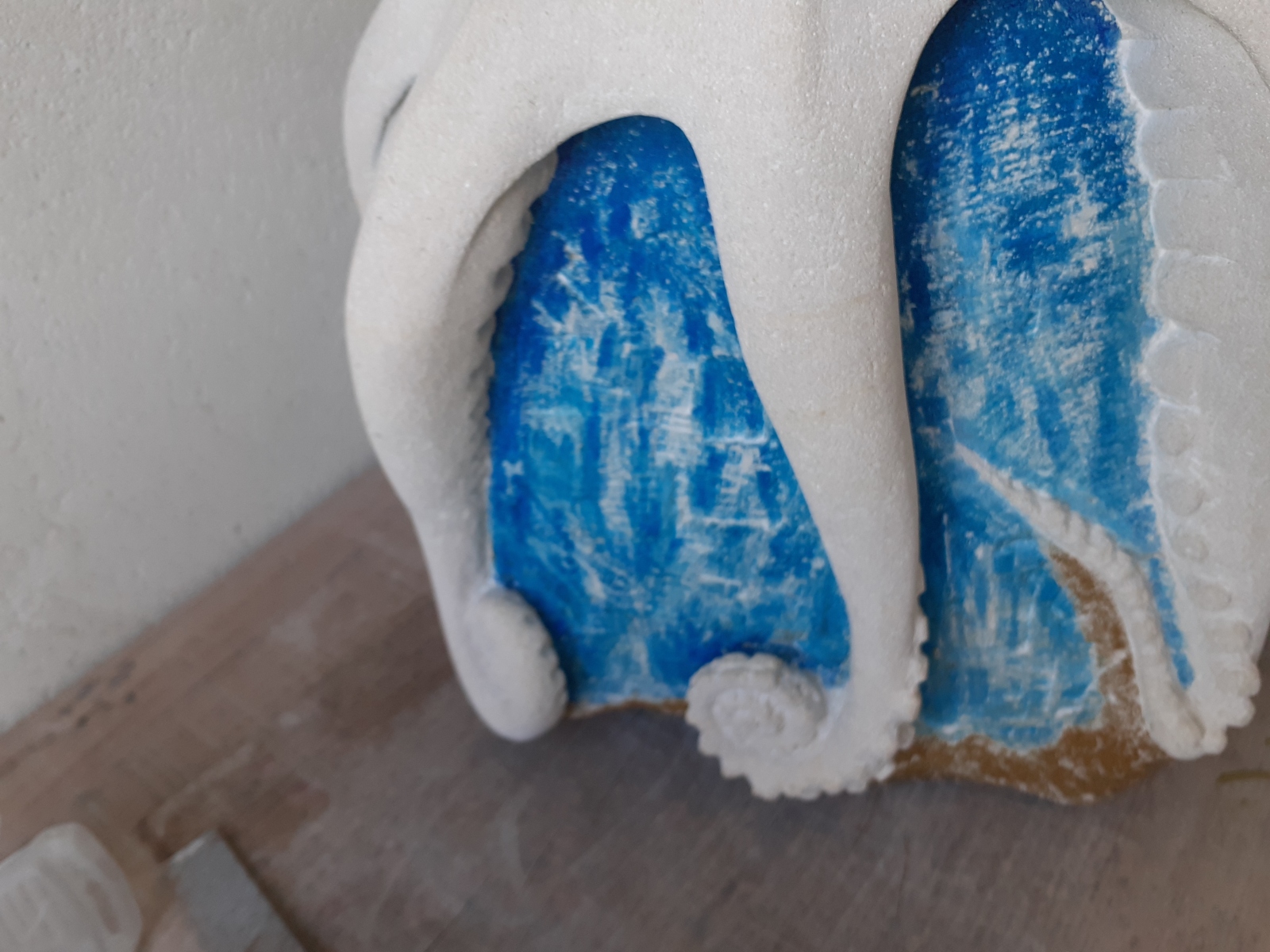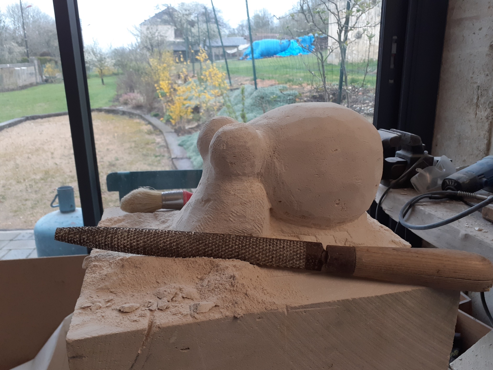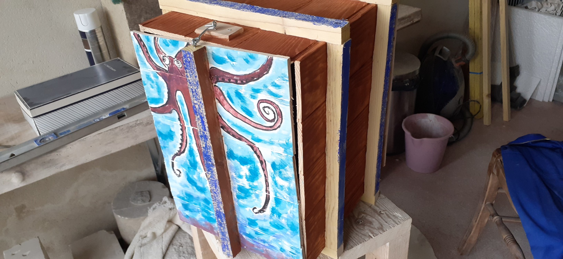 C’est l’animal qui m’a demandé le plus d’heures de travail(entre 100 et 150). A partir d’un bloc de 50 x 30 x 30, j’ai commencé par dégager la tête, puis les tentacules, grossièrement. Une fois la forme générale obtenue, j’ai fignolé les tentacules. La première version était pierre nature sur fond bleu, et pesait 3 tonnes. Mais le résultat ne me plaisait pas, et je suis tombé sur une pieuvre rouge brique, qui tout de suite m’a emballée. J’ai donc peint l’ensemble, et j’ai creusé la pierre pour en faire une caverne blanche à fond sombre.